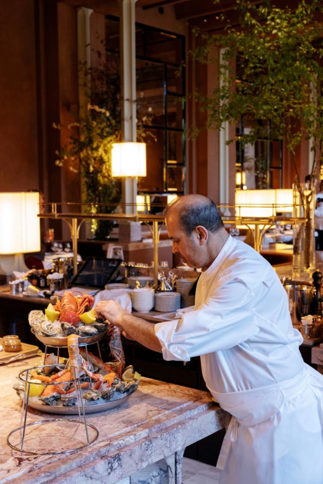 Inside the lofty eating room, because of the oversize home windows and intelligent placement of mirrors, those self same views can nonetheless be loved. The inside area, with its welcoming cocktail bar, musical podium for the reside jazz ensemble, curvilinear banquette seating, and vigorous, well-stocked oyster bar on the far finish, brings to thoughts a theatrical stage set. It may possibly really feel romantic and intimate, or bustling and animated.
