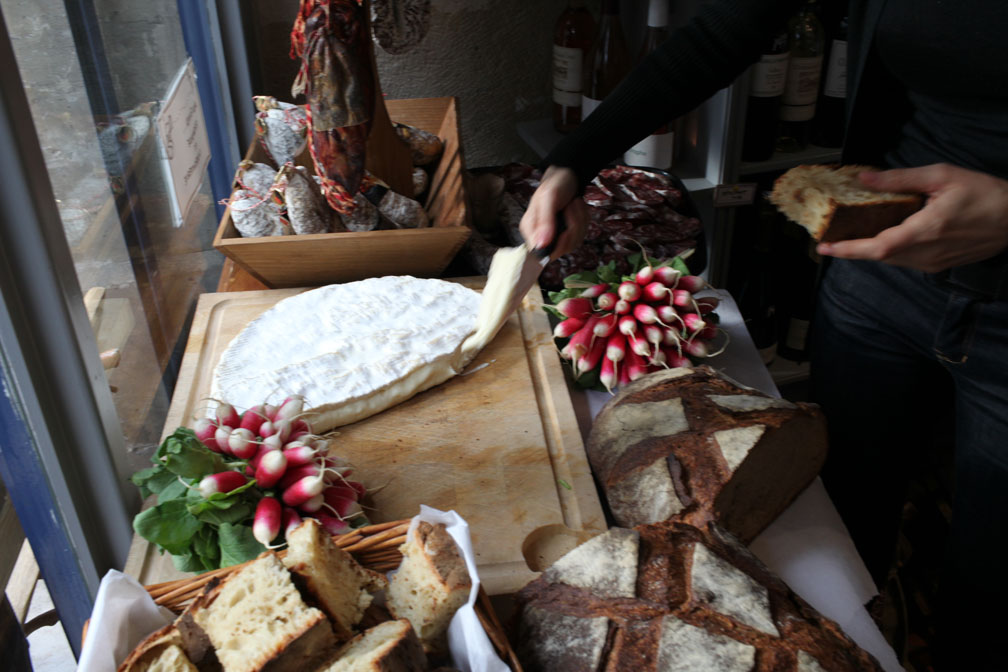Heaps of sausage, a large Camembert, and crusty bread from Julien
