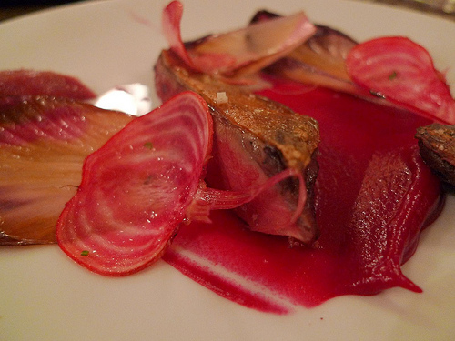 John Talbott (2011) “… nice butcher block tables, spiral iron staircase, seemingly unfinished previous partitions… asparagus stalks with orange slices, microtomed carrots and tiny leaves of mountain spinach (arrach) and a terrine of layered foie gras, canard was it?, some scallion-like vegetable and a beet puree. Terrific!”