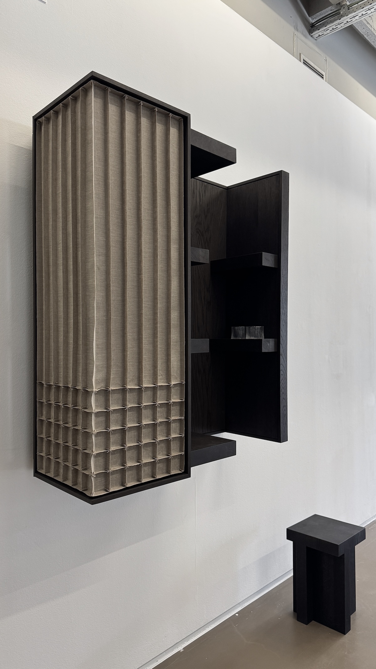 COMO wall attracts on the designers’ private histories. Maxim Lannaux makes use of wooden harvested by his father within the Sonian Forest, whereas Corentin Lefebvre integrates linen painter’s canvas from his father’s framing workshop. The piece references the structure of ecclesiastical polyptychs and follows the duo’s attribute 5:8 proportional system.