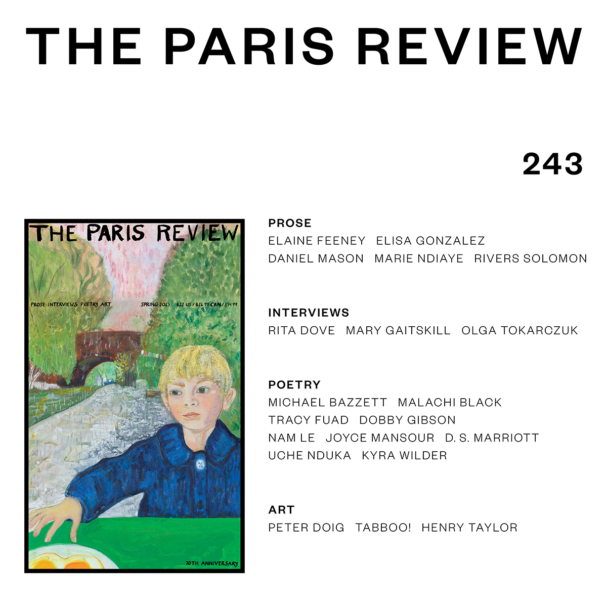 This spring rings within the journal’s seventieth anniversary, and twenty years because the lack of its visionary longtime editor. To mark the event, problem no. 243 has a canopy created for the Evaluation by Peter Doig—impressed, he instructed us, by a birthday card he made for his son Locker—and contains not two however three Writers at Work interviews: with Dove, with the American quick story author and novelist Mary Gaitskill, and with Olga Tokarczuk, winner of the 2018 Nobel Prize in Literature. In some ways, although, this problem is according to the others in our lengthy historical past, that includes the perfect prose, poetry, and artwork that we may muster, by writers and artists you’ve heard of and a few you haven’t. You’ll discover prose by Marie NDiaye, Elisa Gonzalez, Rivers Solomon, Daniel Mason, and Elaine Feeney; poems by Nam Le and D. S. Marriott; and artworks together with a portfolio by Tabboo!, that includes work impressed by phrases he associates with the journal (together with “excessive falutin,” “bon vivant,” and “wreaking havoc”). We’re grateful to everybody who has appeared in our pages, and to all of the individuals who have shepherded the Evaluation over the previous seven a long time, in order that this one can land in your mailbox because the season turns.