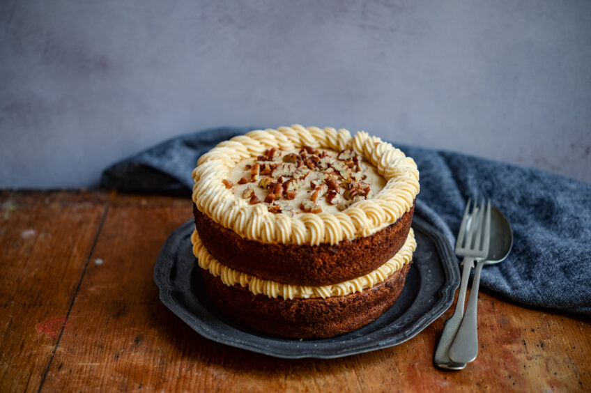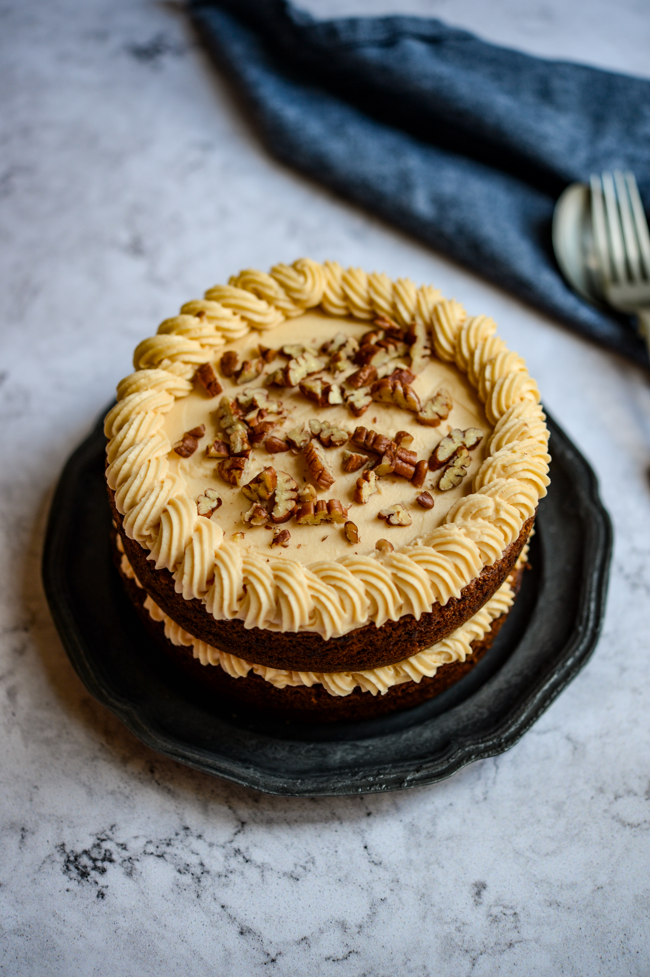 Subsequent place the second sponge on high with the flat aspect from the bottom of the tin dealing with upwards. Unfold a skinny layer of buttercream on high after which pipe an ornamental ring of icing across the edge.Sprinkle with the remaining pecans and place within the fridge to agency up just a little.
